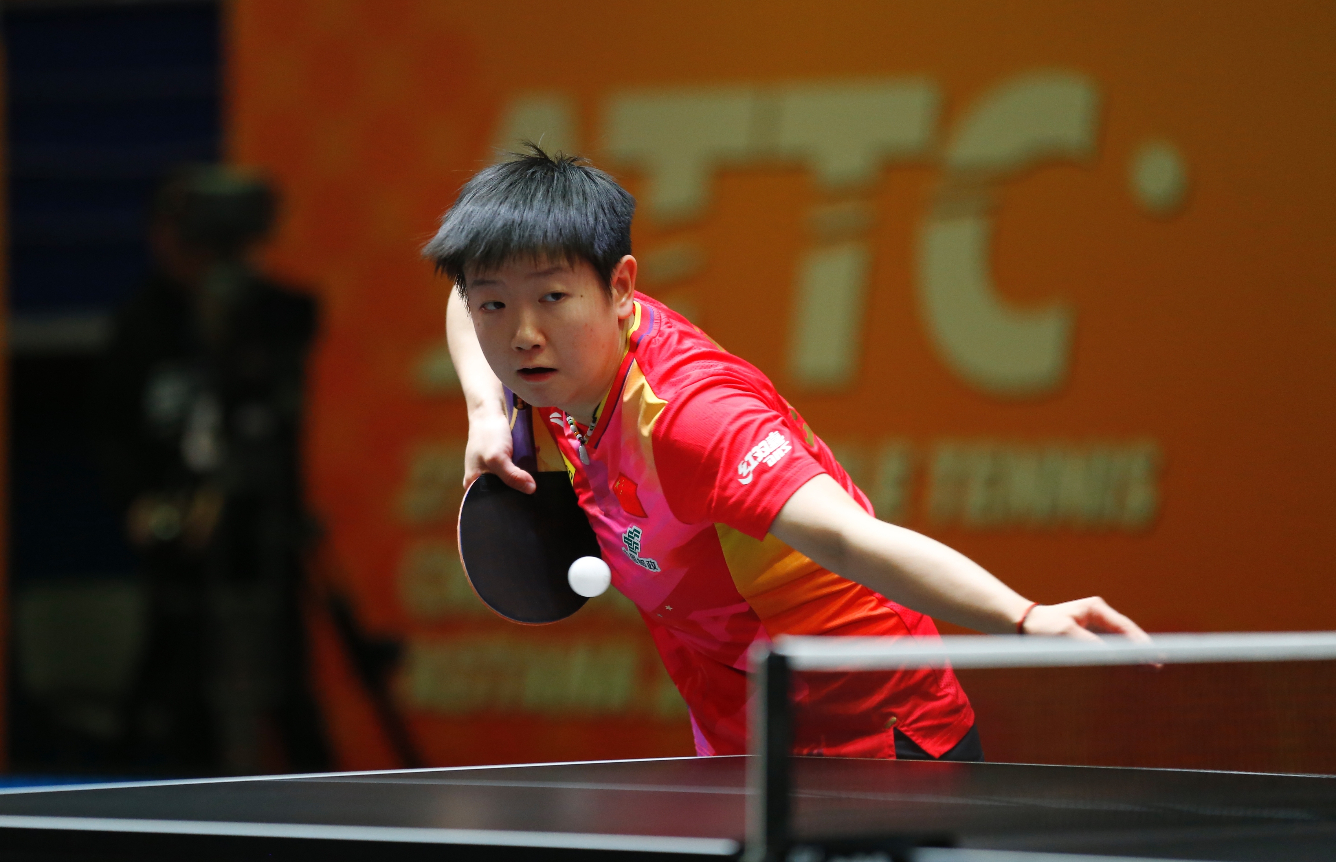 10月8日,中国队选手孙颖莎在比赛中回球。最终,她3比2战胜朝鲜队选手边松景。新华社发(奥斯帕诺夫摄)
