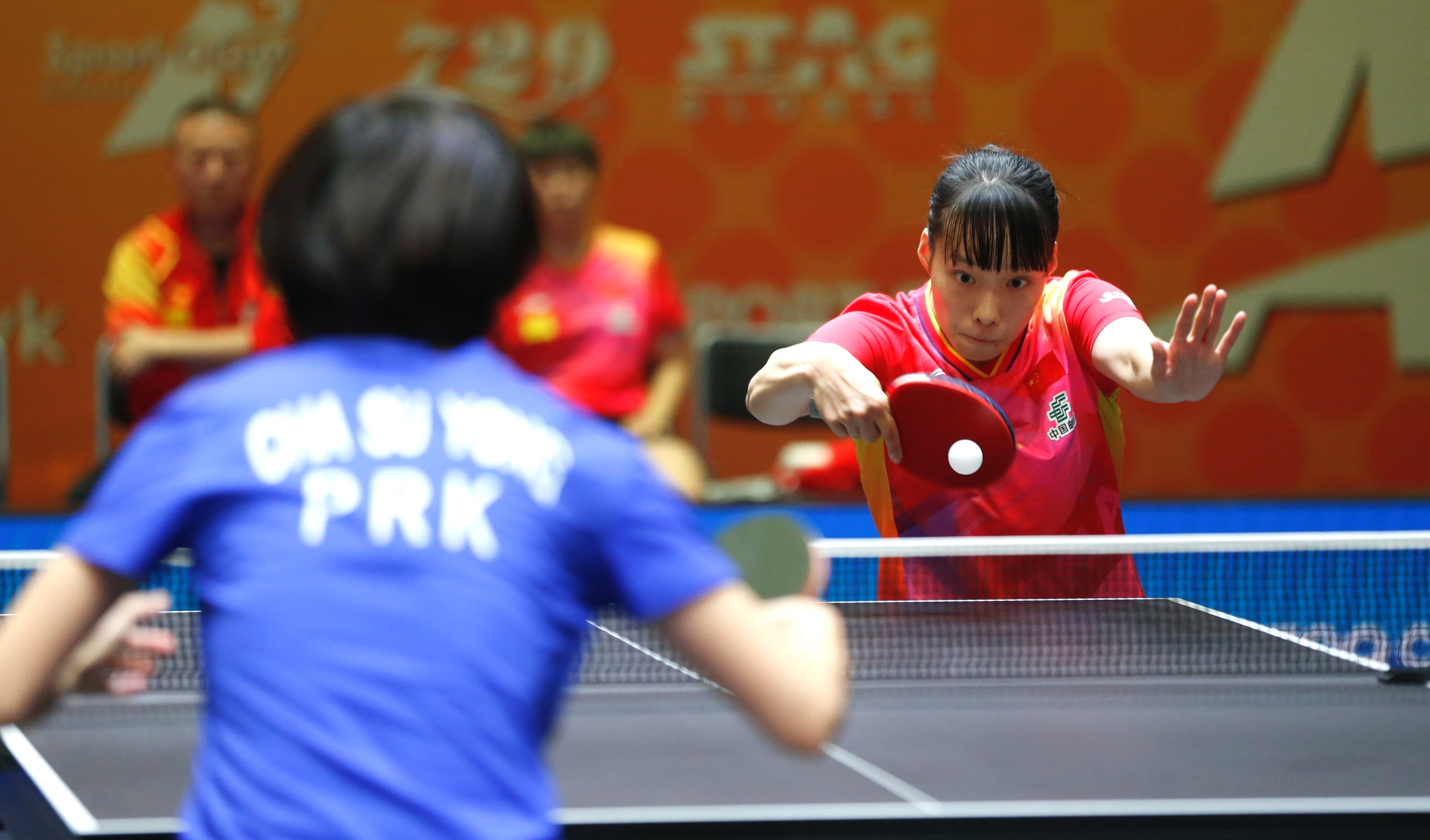10月8日,中国队选手石洵瑶(右)在比赛中回球。最终,她3比2战胜朝鲜队选手车秀英。新华社发(奥斯帕诺夫摄)