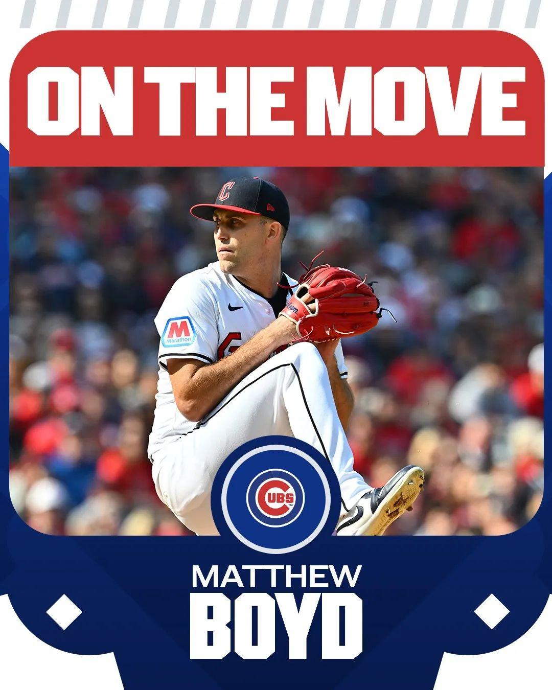 据多方报道,小熊队在休赛期的首次大动作中将马修-博伊德(Matthew Boyd)纳入轮换阵容,并与这位资深左投手达成了一份为期两年、价值2900万美元的合同,并在此基础上还有可能获得100万美元的表现奖金。今年博伊德在TJ手术后成功复出,在守护者的八次先发中取得了2胜2负的战绩,防御率为 2.72。新赛季,这位来自华盛顿的选手或将加入贾斯廷-斯蒂尔(Justin Steele)、今永昇太(Shota Imanaga)和詹米森-泰扬(Jameson Taillon)之列,为小熊先发投球。