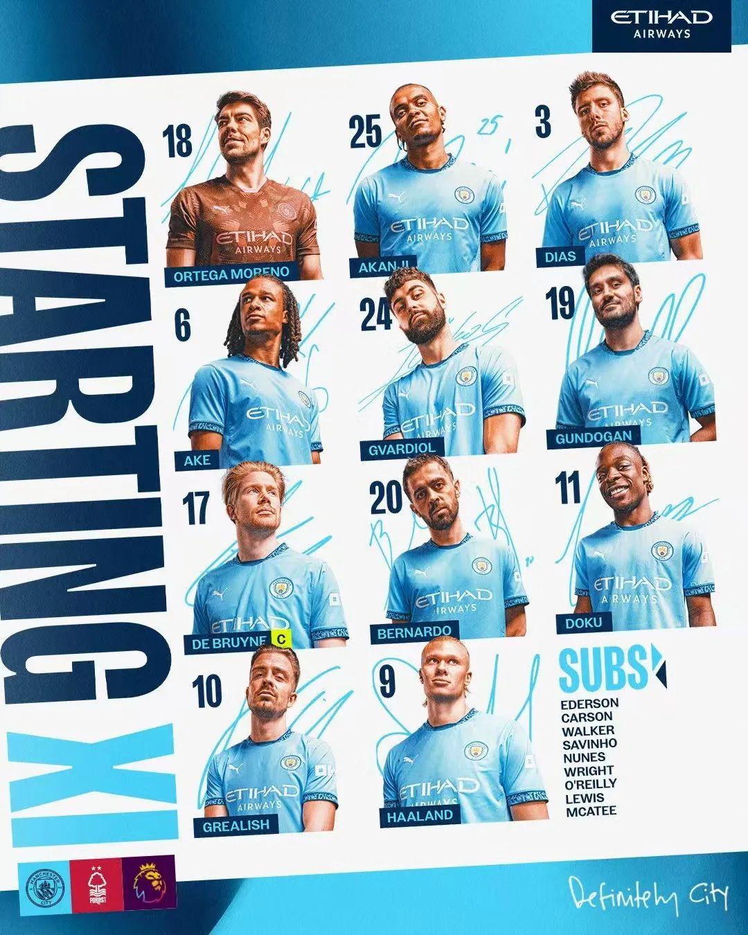 替补:埃德森、卡森、沃克、萨威尼奥、努内斯、赖特、奥赖利、刘易斯、麦卡蒂