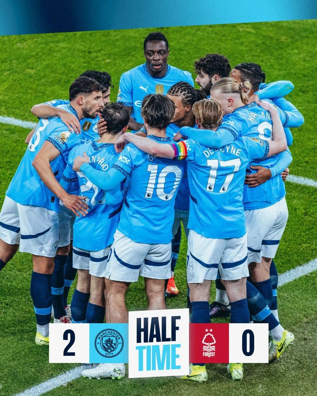上半场比赛结束,我城暂时2-0领先!