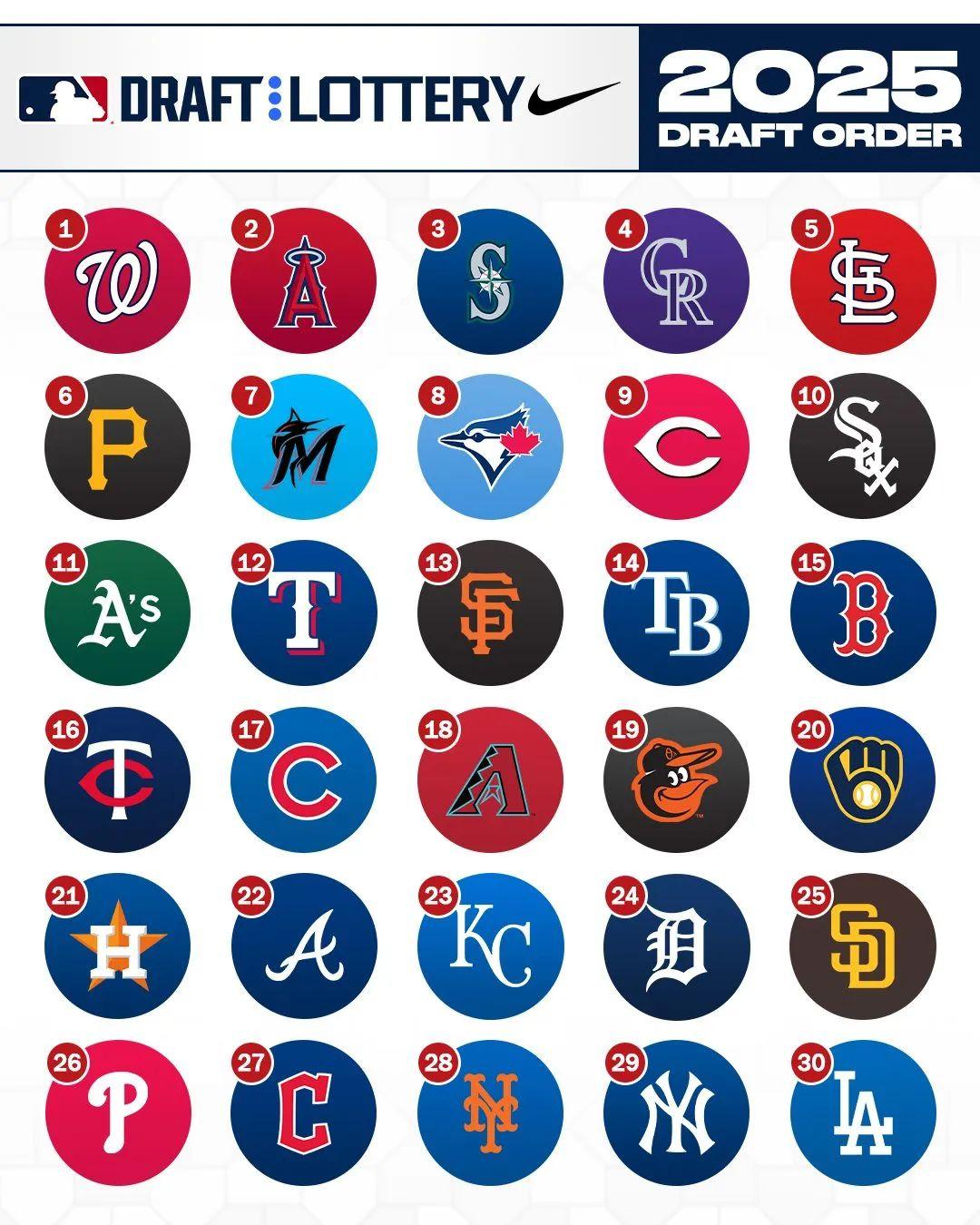 冬季会议期间的另一大重头戏便是2025赛季选秀的抽签。本次抽签的签位将决定各支队伍在2025年选秀期间的选人顺序。根据规则,所有未能进入季后赛的球队将有机会抽到状元签。在今年的18支未能进入季后赛的队伍中,有16支球队获得了抽取状元签的资格,仅有白袜和运动家队被排除在外。今年的状元签被华盛顿国民拿下,而洛杉矶天使队和西雅图水手队则拿到了第二位和第三位。2025年选秀顺序如下: