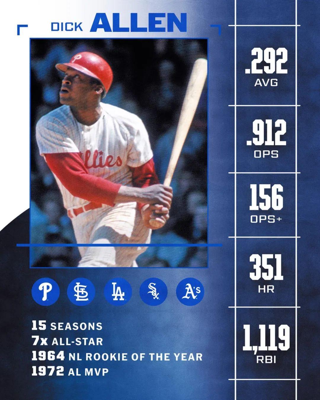 迪克-艾伦在1963-1977年间活跃于大联盟,主要为费城费城人队和芝加哥白袜队效力。他参加了7次全明星赛,并在1972年赢得了美联MVP(最有价值球员奖)。艾伦的OPS+(加权攻击指数)(156)是费城费城人队历史上最高的,超越了名人堂球员迈克-施密特(Mike Schmidt),并与威利-梅斯(Willie Mays)和弗兰克-托马斯(Frank Thomas)持平,在所有至少有7000次打席的球员中排名第14位。