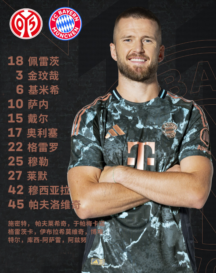 本场比赛,佩雷茨镇守球门,金玟哉与戴尔搭档中后卫,格雷罗、莱默分列两侧,基米希与帕夫洛维奇坐镇中场,奥利塞、穆西亚拉、萨内以及穆勒组成前场攻击群。