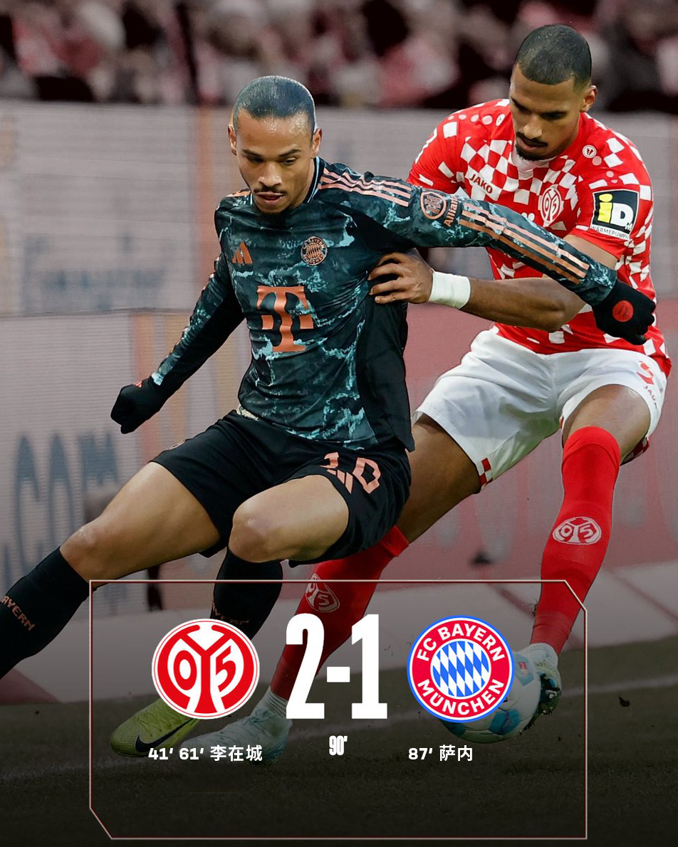 此后双方再无建树,最终全场比赛结束,拜仁1-2不敌美因茨。