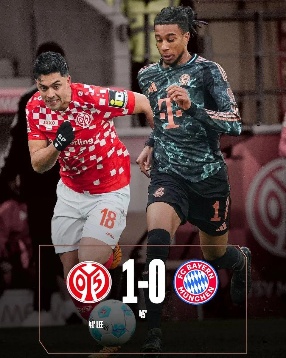 比赛第41分钟,美因茨发动反击,李在城破门,拜仁0-1美因茨。上半场比赛结束,拜仁暂时0-1落后。