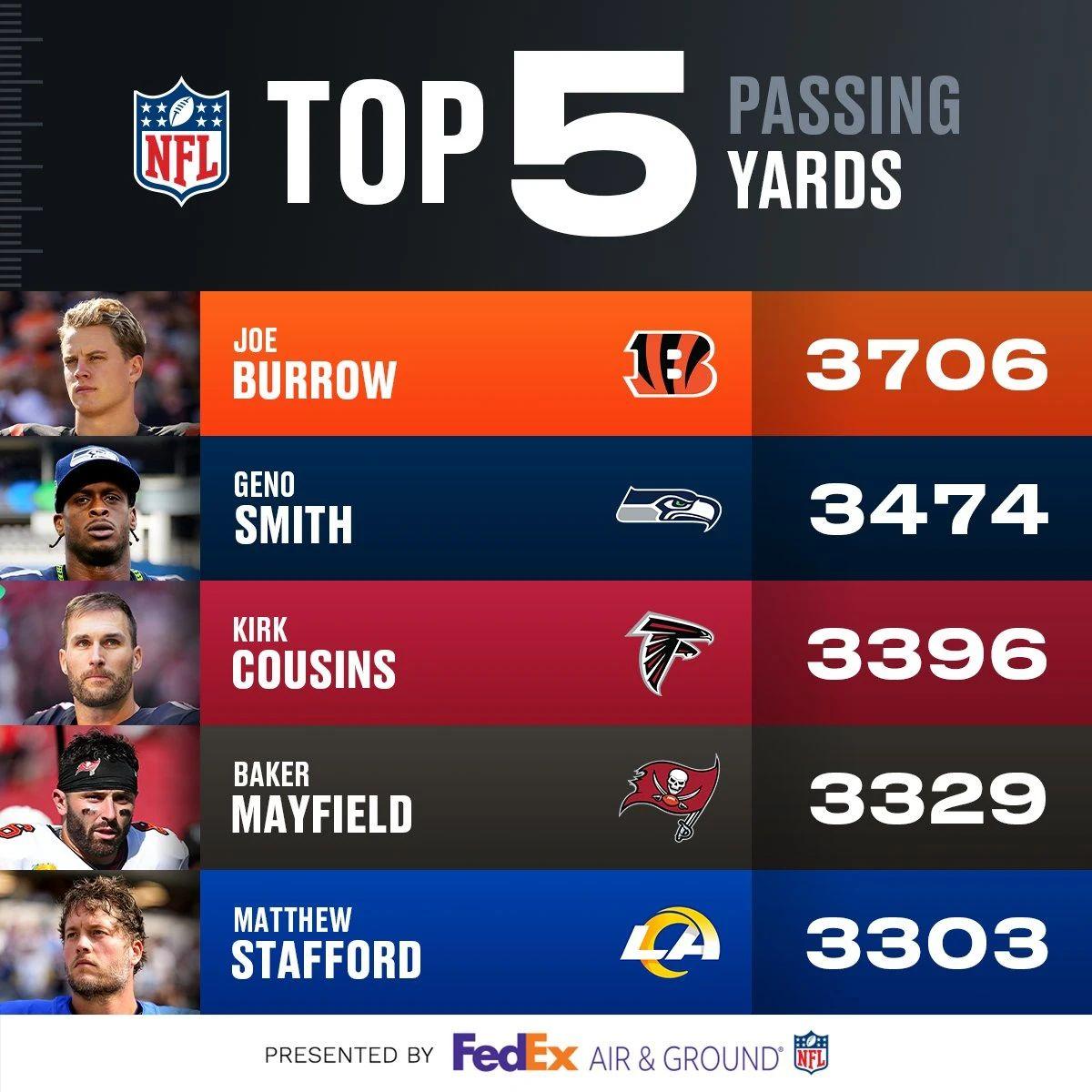 传球码数榜:终于赢了!乔-伯罗率队绝杀牛仔,顺带扩大传球榜领先优势!