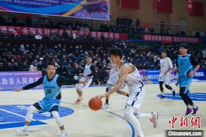 图为互助县篮球队(白衣)和新疆超音速篮球队队员在比赛中。马铭言 摄