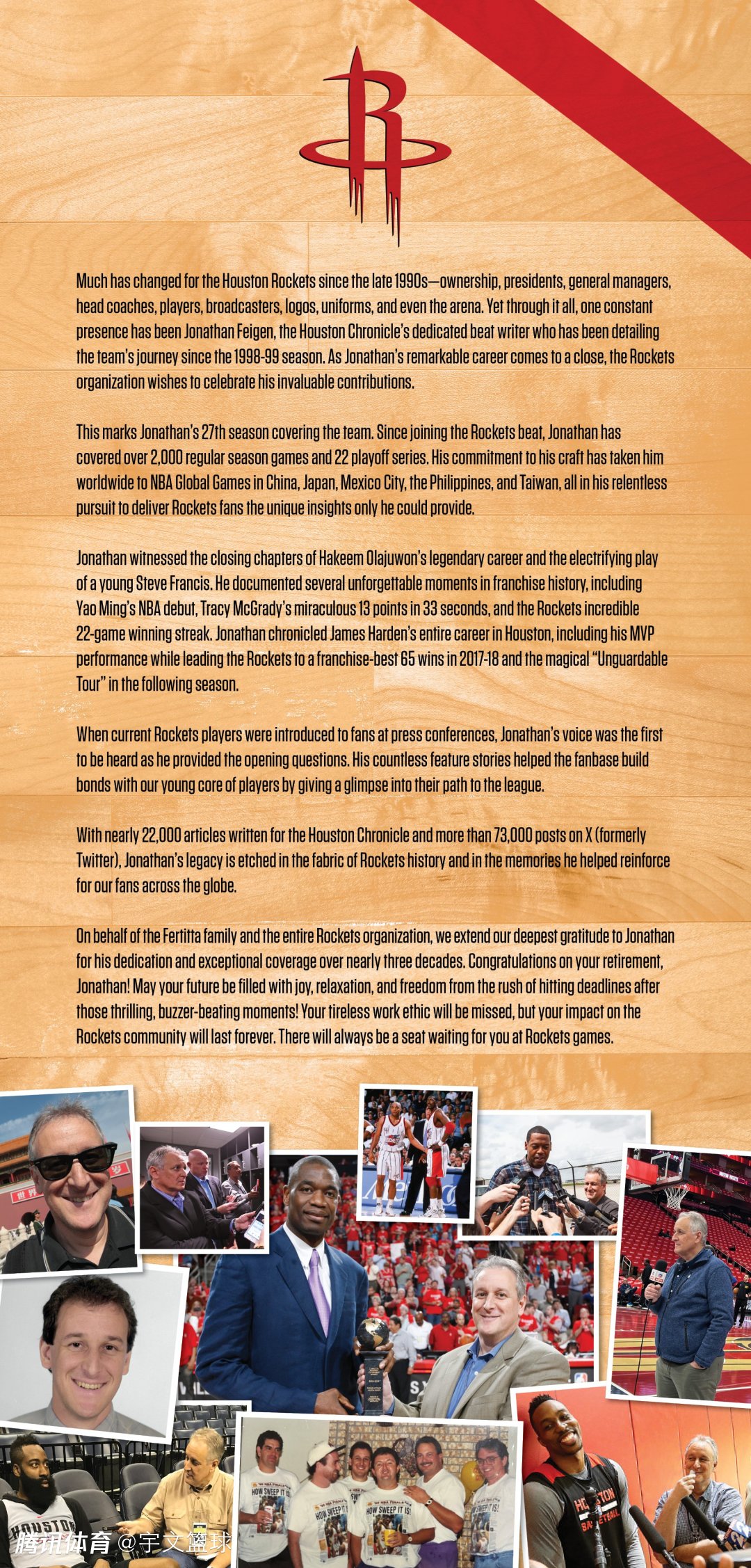 费根对每一名火箭球员都有深刻影响,他在《休斯顿纪事报》撰写了超过22000篇文章,在社交媒体发布了超过77000条消息,他的故事也会被刻在火箭的历史之中。为了感谢费根,火箭将会永远在比赛中留给他一个位置。最后,祝福费根退休快乐!
