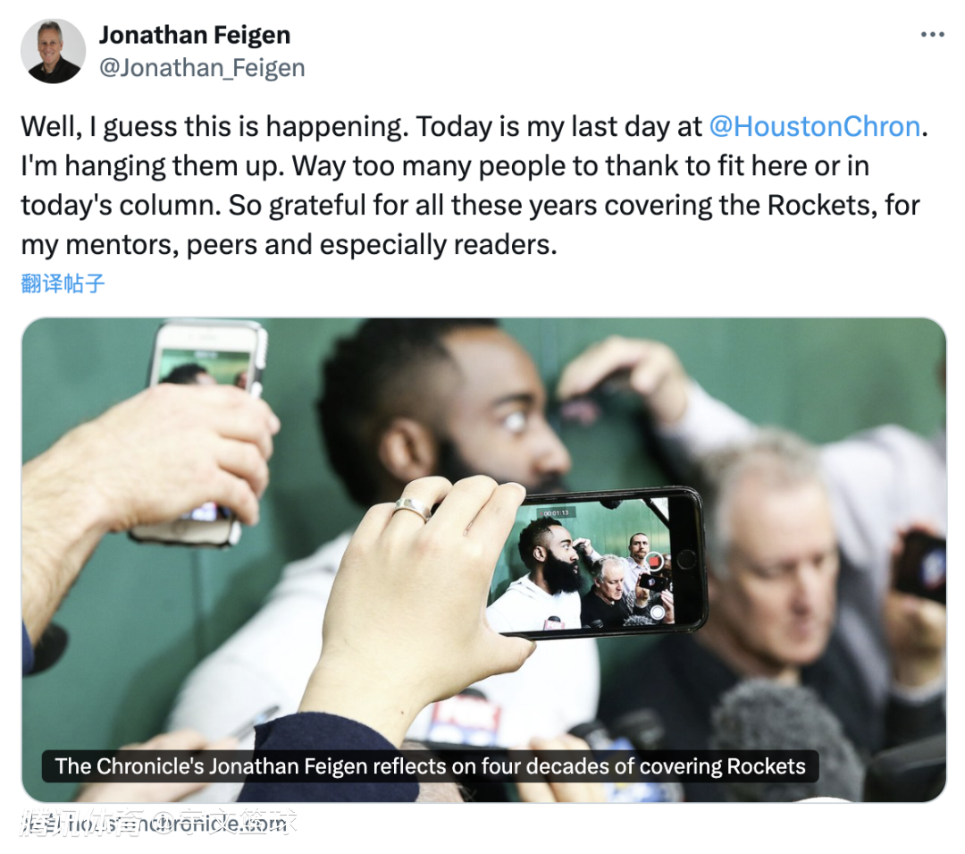 “好吧,我想这就是要发生的事情。今天是我在《休斯顿纪事报》的最后一天,我要挂断电话了,要感谢的人太多了,这里或今天的专栏里都写不完。非常感谢这些年来报道火箭队的恩师、同事,尤其是读者。”费根通过社交媒体说道。随后他正式通过长文,回顾了他漫长的记者生涯,给自己画下一个圆满的句号。