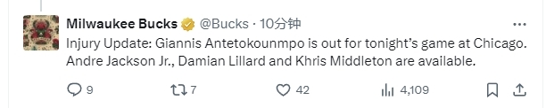 雄鹿队在官方推特上写道:“字母哥将缺席今晚在芝加哥的比赛。小安德烈-杰克逊、达米安-利拉德和克里斯-米德尔顿可以出战。”