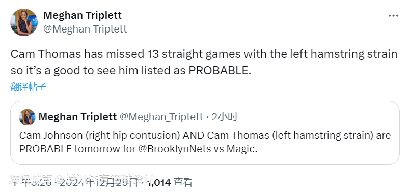 随后NBA记者Meghan Triplett在个人推特上写道:“卡姆-托马斯因左腿筋拉伤已连续缺席13场比赛,因此他被列为大概率上场,这是件好事。”