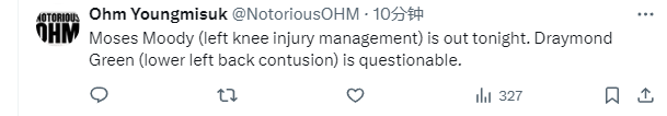勇士队方面,穆迪(左膝伤势管理)、佩顿二世(左小腿拉伤)缺席比赛,德雷蒙德-格林(左下背部挫伤)出战成疑。