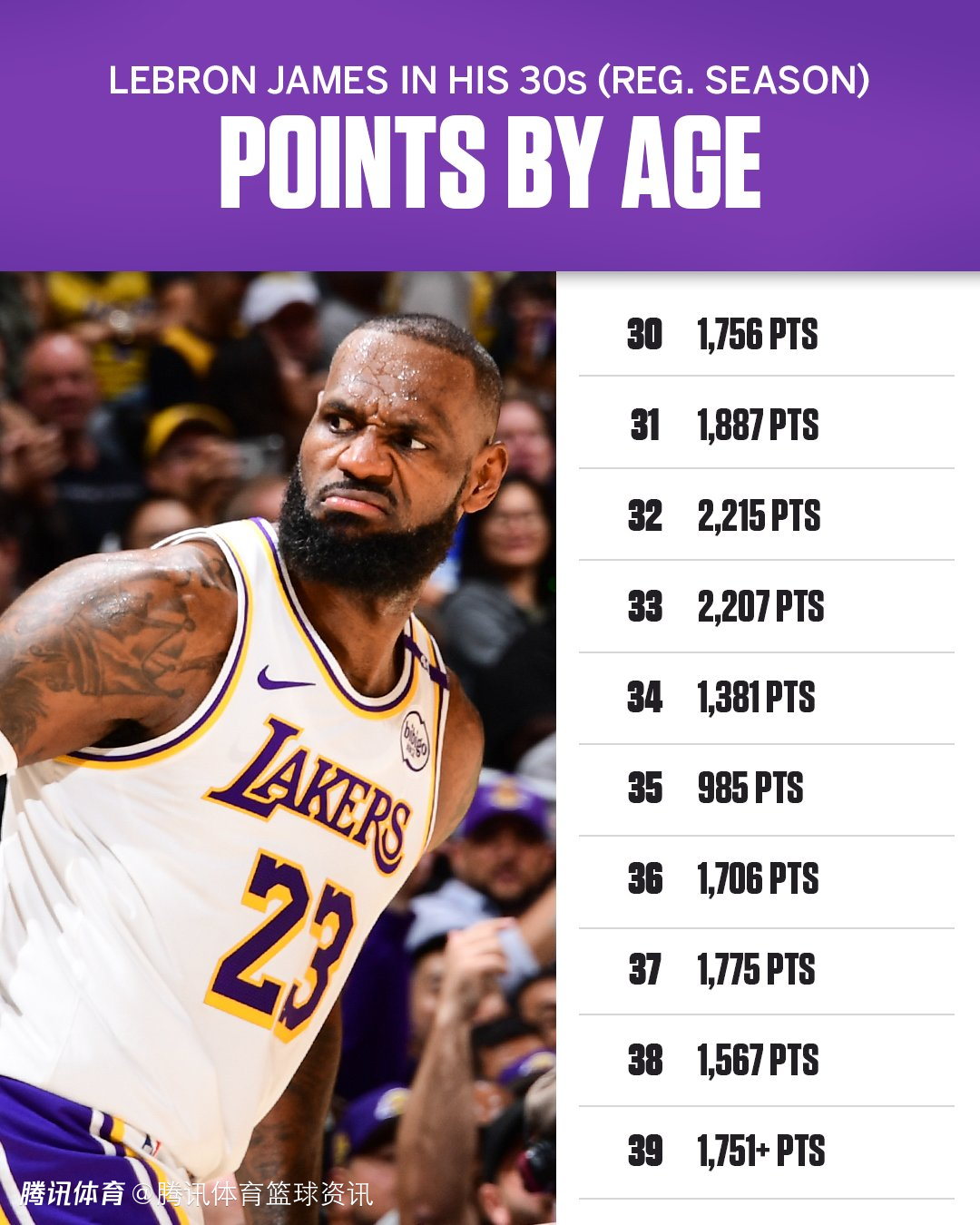 根据数据统计显示,詹姆斯30岁期间在常规赛中拿到1756分,31岁期间拿到了1887分,32岁期间拿到了2215分,33岁期间拿到了2207分,34岁期间得到了1381分,35岁期间拿到了985分,36岁期间拿到了1706分,37岁期间拿到了1775分,38岁期间拿到了1567分,39岁期间拿到了1751分,今晚还将继续刷新这一数字。