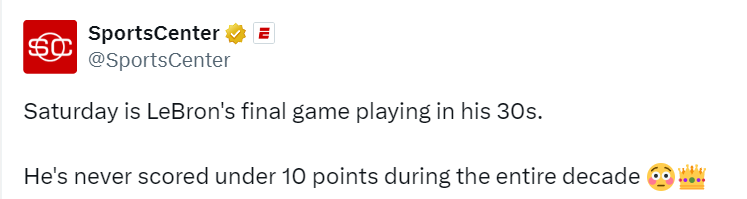 2024-12-29 08:50北京时间12月29日,根据美国媒体Sports Center报道,詹姆斯即将在今日对阵国王队的比赛中迎来自己40岁前的最后一场比赛,而在进入30岁之后,詹姆斯近10年来从没有任何一场比赛得分未达到两位数。