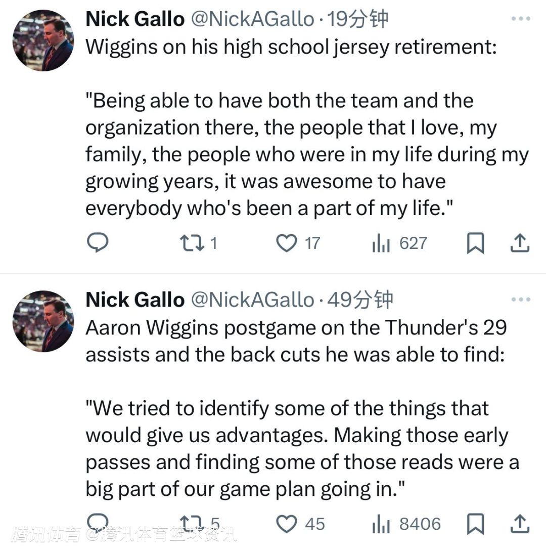 在谈到自己的高中球衣退役时,威金斯说道:“能够有球队和组织在那里,有我爱的人,有我的家人,有在我成长过程中陪伴我的人,能有这些人的陪伴真是太棒了。”