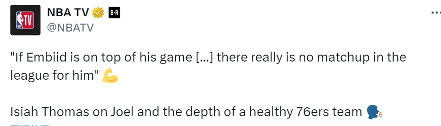 赛后,篮球名宿伊赛亚-托马斯对恩比德的表现发表评论,他说道:“如果恩比德保持健康,处于他的最佳状态,联盟中真的没有人能与他匹敌。”