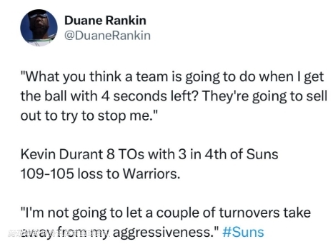 杜兰特:不会因失误影响侵略性 我们在防守端表现出色令人鼓舞
