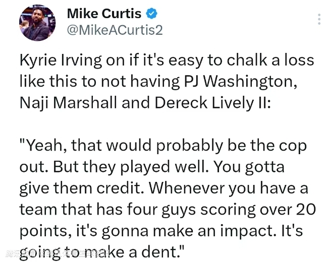 此役,独行侠队缺少了PJ-华盛顿、纳吉-马绍尔以及莱夫利二世,东契奇也因伤休战,可欧文依然不愿意将失利归咎于某些队友们没有打。他表示:“是的,这可能是个借口。但是开拓者队打得很好。每当你的球队有四个人得分超过20分的时候,就会产生影响。”