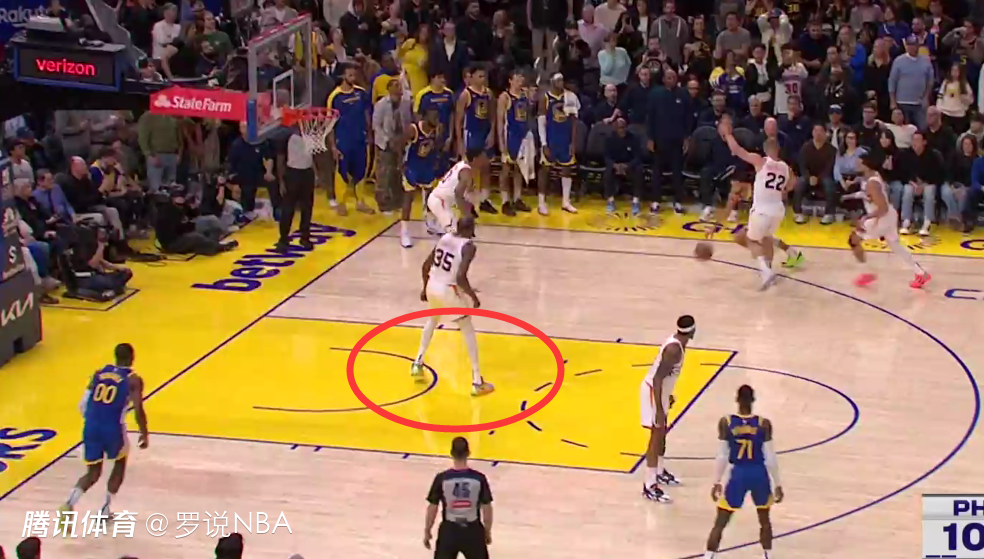 距离比赛结束还有44.4秒时,杜兰特在没有积极防守对方球员的前提下,在己方禁区停留时间超过3秒,这是一次漏吹的防守3秒违例,吃亏的是勇士,获利的是太阳。