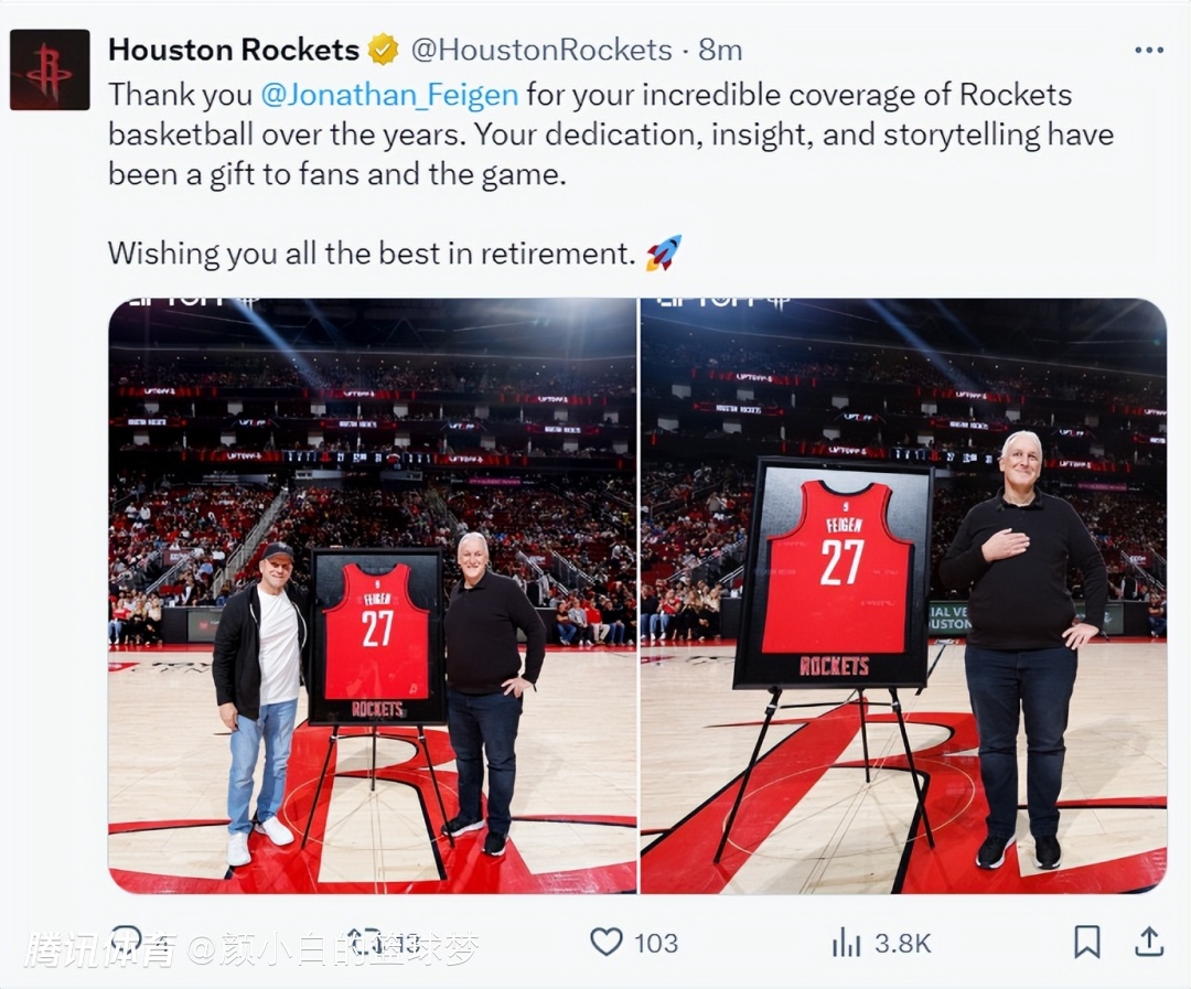 火箭中场结束为随队记者乔纳森-费根进行了球衣退役仪式,他在火箭工作了足足27年之久,球衣号码也是27。
