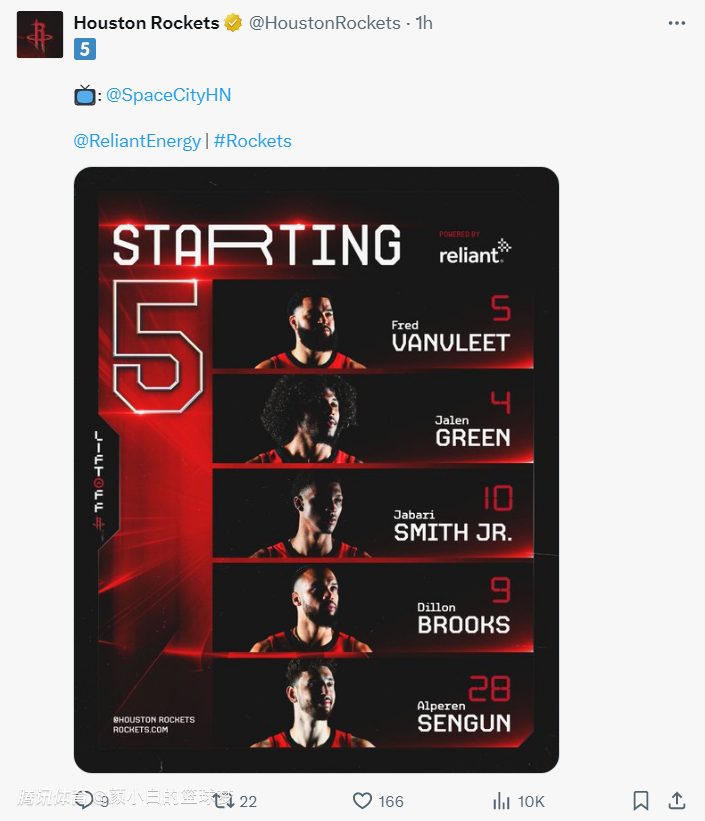 火箭此役狄龙-布鲁克斯复出,杰肖恩-泰特生病轮休,伊森小腿伤势继续缺席。