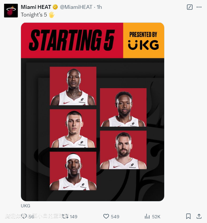 热火:罗齐尔、希罗、海史密斯、乐福、阿德巴约;