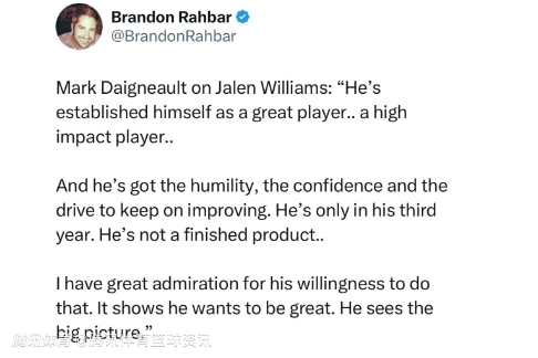 谈到杰伦-威廉姆斯的表现,戴格诺特这样说道:“他已经确立了自己作为一名优秀球员以及一名极具影响力球员的地位。而且他具备谦逊的品质、十足的信心以及不断进取的动力。他才进入职业生涯第三年,还远未达到上限。我非常钦佩他愿意去不断提升自己的这份态度。这表明他渴望变得出类拔萃,他有着长远的眼光。”