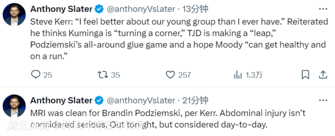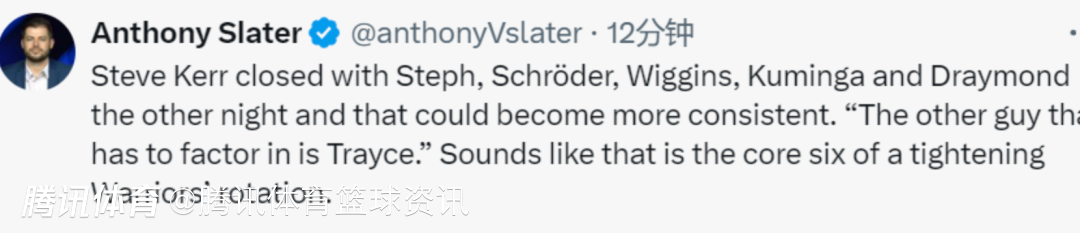 另外勇士队记Anthony Slater报道,此前比赛最后时刻,科尔派遣库里、施罗德、维金斯、库明加和追梦在场上,而这套阵容可能会在接下来变得更加稳定,另外戴维斯(TJD)可能会是一个X因素,这就是勇士队轮换阵容中的核心六人。