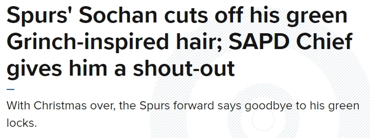 “圣诞节结束了。”索汉在社交媒体上写道。值得一提的是,索汉的绿色头发很受球迷喜爱,一些马刺球迷戴着绿色假发出现在比赛现场,以表达他们对索汉的支持。而在此前马刺队和尼克斯队年终大战的动画片中,也出现了索汉绿色头发的造型。