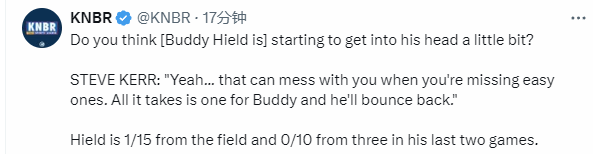 希尔德在过去两场比赛中总计15投1中,三分球10投0中,在谈到希尔德的状态时,科尔说道:“但你错失简单的投篮时,你会受到困扰。但只要希尔德能投中1个球,我相信他就会反弹。”