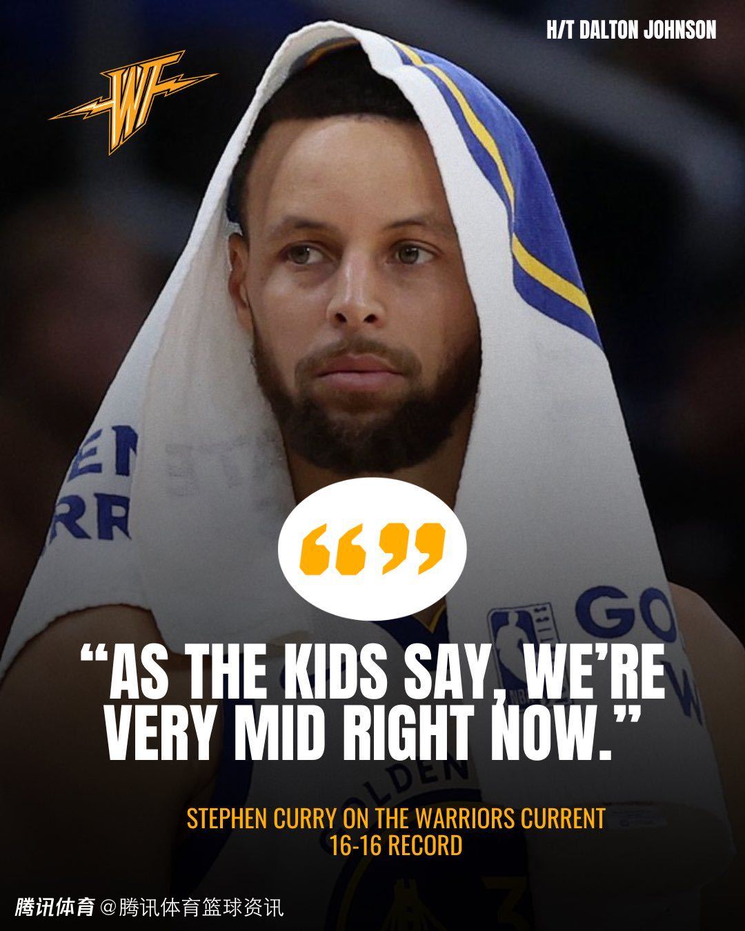 谈到球队16胜16负的战绩时,库里这样说道:“用现在比较流行的说法讲,我们现在就是普通水平,而且非常平庸。”