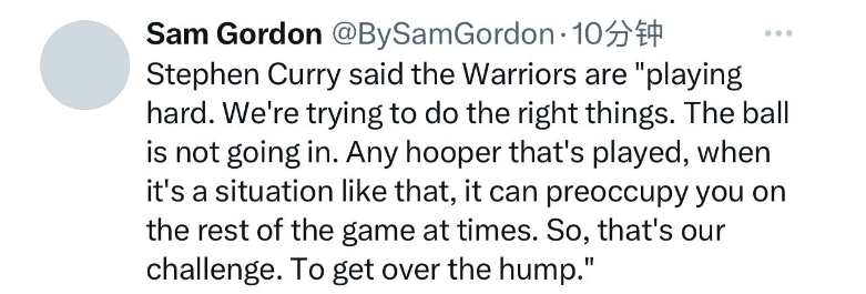 库里继续说道:“我们最近打得很艰难。我们正在努力做正确的事,只是球投不进。任何一名篮球运动员遇到这种情况时,有时必须专注于比赛的其余部分。所以,这就是目前我们面临的挑战,我们必须度过这个难关。”