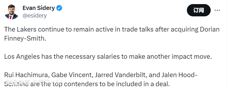 名记Sidery也报道称,湖人会继续在交易谈判方面保持活跃。他们拥有足够的薪金去再次产生影响。八村垒、文森特、范德比尔特和胡德-席菲诺是湖人主要的谈判筹码。佩林卡可能正在酝酿更大的交易。
