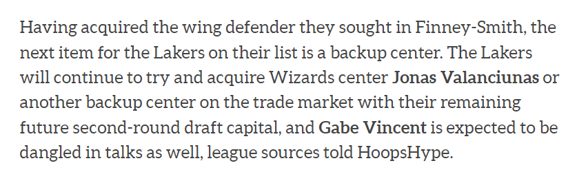 HoopsHype名记Scotto报道称,湖人的下一个目标就是替补中锋。消息人士透露,湖人将继续尝试用他们剩余的次轮签在交易市场上收购奇才中锋瓦兰丘纳斯,或者是另一个替补中锋,文森特可能成为潜在的谈判筹码。