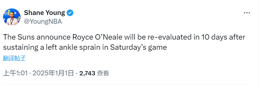 2025-01-01 07:00北京时间1月1日,太阳官方更新伤情,罗伊斯-奥尼尔因脚踝扭伤,将在10天后重新评估伤势 ,这意味着他至少要缺阵10天。奥尼尔在上一场对勇士的比赛中不慎扭到脚踝,退出比赛。