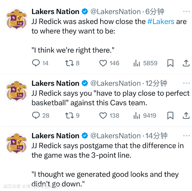 另外雷迪克也表示,对战骑士这样的队伍,球队必须要打出“接近完美”的比赛,才有可能获得胜利。被记者问及湖人离他想要在赛季结束前达到的标准还有多远,雷迪克表示:“我认为球队现在就达到了。”