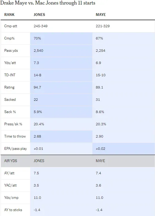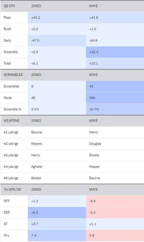 梅耶在前11场先发中取得了2-9的战绩,主要是因为当他先发时,爱国者的防守/特勤组EPA排联盟第26。