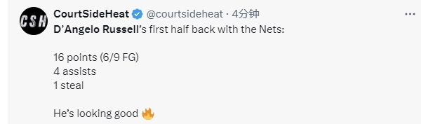 第二节比赛,拉塞尔更是内突外投火力全开,单节7投4中独得9分,帮助篮网队与对手紧咬住了比分。而他的出色表现,也获得了不少篮网记者和球迷的点赞。