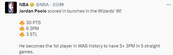 连续5场命中5+三分!普尔成奇才队史首人 本赛季1数据超过库里