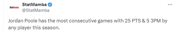 本赛季至今,普尔至少投中5个三分球的比赛场次还要超过斯蒂芬-库里,而能单场至少砍下25分并命中至少5个三分球的比赛场次更是高居联盟之首。