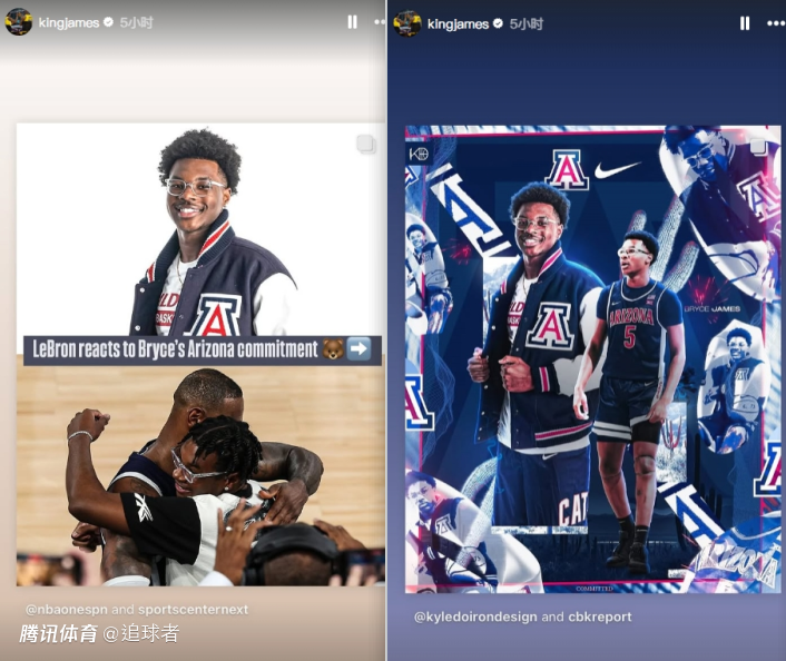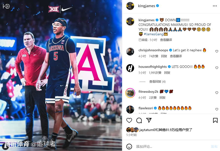 詹姆斯更新Ins晒布莱斯加盟亚利桑那大学的海报,配文写道:祝贺布莱斯,真为你感到骄傲#詹姆斯家族(王冠表情)。