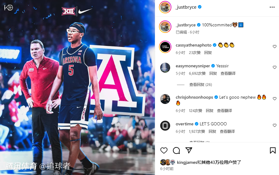 布莱斯亲自宣布:我100%承诺加盟亚利桑那大学;浓眉、保罗都为布莱斯点赞,杜兰特则是在评论区为布莱斯鼓掌,很明显,布莱斯的叔叔们都为布莱斯而开心。