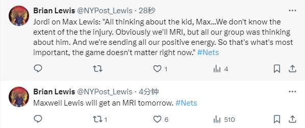 首秀仅打1分钟就伤退!篮网主帅:刘易斯将接受核磁共振检查