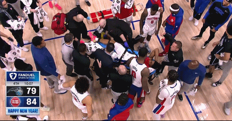 2025-01-02 11:30北京时间1月2日,NBA常规赛,活塞坐镇主场对战魔术,比赛末节,魔术球员科尔-安东尼倒地抢球侧面重压艾维膝盖,后者倒地不起,随后直接上了担架,被推离出场。