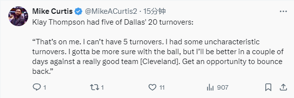 2025-01-02 12:50北京时间1月2日,NBA常规赛继续进行,独行侠队99-110不敌火箭队。独行侠队球员克莱-汤普森此役出战32分钟,11投6中(三分球8投4中)得到了16分5篮板1助攻1抢断,在场正负值-21。赛后,汤普森接受媒体采访,点评了比赛。