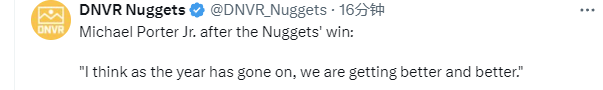 在第三节比赛中,小波特担任独得11分,带领掘金队打出一波28-9的攻击波,一举拉开了比分。而值得一提的是,在赛后掘金队主教练马龙也谈到了球队攻防失衡的问题,他同样认为掘金队目前的进攻已经处于精英水准,但依然需要提升防守能力。