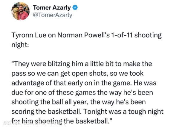 谈到本场比赛鲍威尔11投1中的表现,泰伦-卢表示:“对手对他采取了一些包夹,迫使他传球,这样我们能获得空位投篮的机会,所以比赛刚开始的时候我们利用了这一点。鉴于他本赛季的投篮表现以及得分情况,总会有这样一场比赛投不准的时候。今晚这场比赛他在投篮方面有些艰难,投篮手感不佳。”