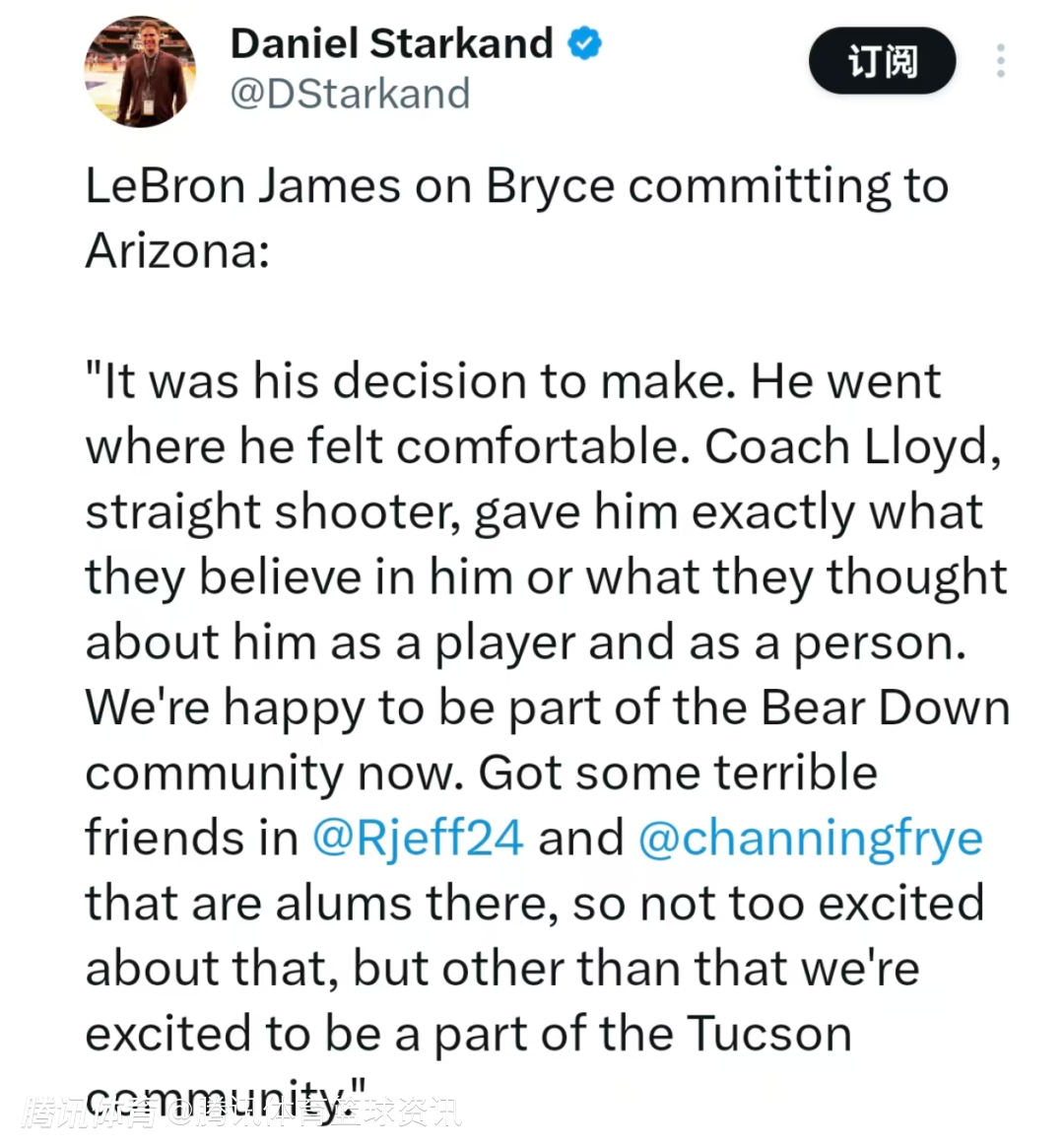 谈及近期自己的二儿子布莱斯决定加盟亚利桑那大学,詹姆斯表示:“这是他自己的决定,他去了他觉得舒服的地方,劳埃德教练(亚利桑那大学主帅)直言不讳地告诉他,他们(球队)对他的信任,以及他们对他作为一名球员或者一个人的看法。”