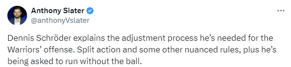 施罗德还谈到了他要如何融入勇士队的进攻体系,他透露自己需要按照勇士队的战术去分享球、注意细节、增加无球跑动,还需要适应勇士队流畅、快节奏的比赛风格。
